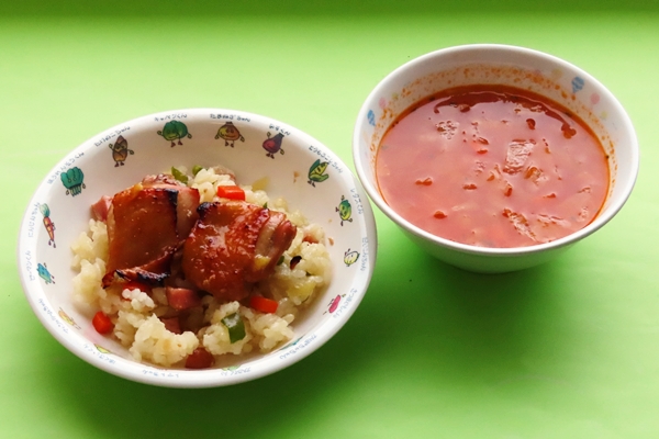 ピラフ風は、コンソメライスに炒めた野菜を混ぜて作っています。お米を炒めて作る方法ではないのでピラフ「風」です(笑)ミネストローネは酸味が少なく、子どもたちにも食べやすかったようです♪