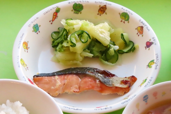 鮭の塩麹焼きは、鮭を塩麹に漬け込んでいるのでいつもよりしっとり柔らかくて子どもたちに大人気でした!お魚大好きなはと組さん、はな組さんはおかわりする子もたくさんいました♪