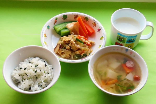 チキンカレーは安定の大人気で、みんなモリモリ食べてくれました♪海藻サラダはしらすが入ったあっさりとしたサラダですが、今年はあっさりサラダが人気なのでみんな完食でした!