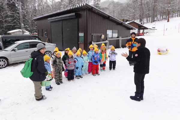 幼稚園の雪山よりもずっとたくさんの雪、長い斜面を、おそるおそる滑り始めた子どもたち。けれどそんな表情もみるみるうちに溶けていき、「一緒に乗ろう!」「次わたしね!」などと言いながら、ゲレンデに元気な声を響かせていました♪