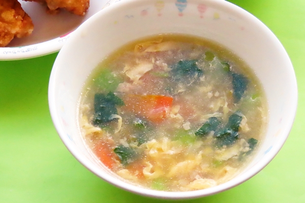 五目スープはたくさんの野菜が入っていて、溶き卵や豆腐も入っているのでとっても満足感のあるスープです。品数が少ない献立の時は一品ずつ具沢山になるようにしています♪