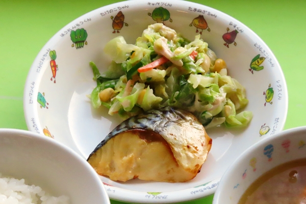 鮭の塩麹焼きは、鮭を塩麹に漬け込んでいるのでいつもよりしっとり柔らかくて子どもたちに大人気でした!お魚大好きなはと組さん、はな組さんはおかわりする子もたくさんいました♪