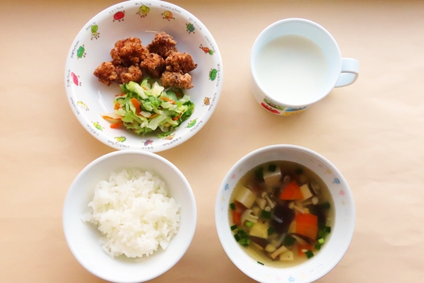 鮭フライは、卵を使わずに小麦粉と水で作ったバッター液をつけてパン粉をまぶして揚げました。サクサクふわふわで子どもたちも食べやすかったようでした♪ちょっと酸っぱいミネストローネも美味しく食べてくれました!