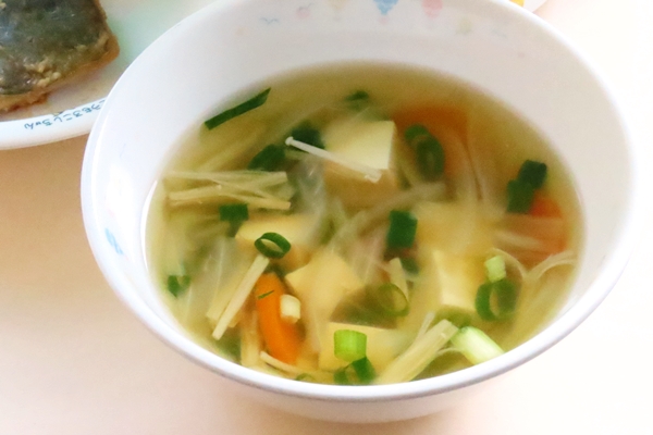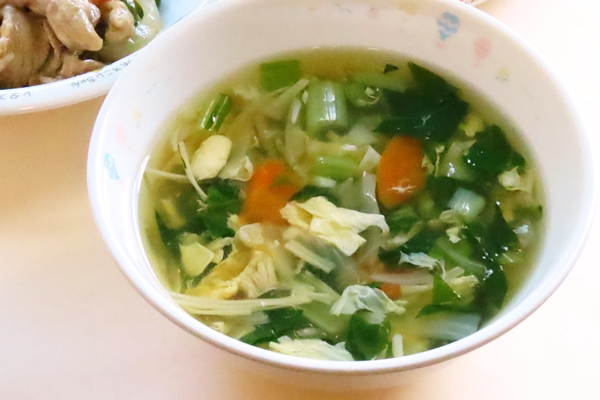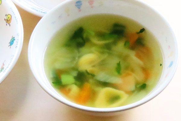マカロニスープには色々なかたちをしたマカロニは入っています。子どもたちはお互いにマカロニを見せ合いながら楽しんで食べてくれました♪スープでふやけたマカロニは大満足の大きさになっていました!