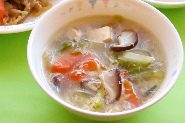 五目スープはたくさんの野菜が入っていて、溶き卵や豆腐も入っているのでとっても満足感のあるスープです。品数が少ない献立の時は一品ずつ具沢山になるようにしています♪