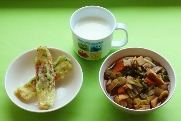 味噌煮込みうどんは、赤だしを使用した名古屋風の味付けになっています。色は濃いですが味は濃くなく、子どもたちも食べやすかったようです。ちくわの磯辺揚げは大大人気でおかわり続出でした!
