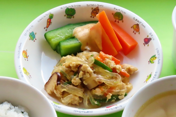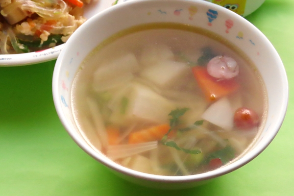 カブのスープは、旬のカブを使用しているので甘みがあってとてもおいしくできました。大根と似ていますが、すぐに柔らかくなるので調理もしやすい食材です♪スティック野菜もみんなかじりとって食べることができました!