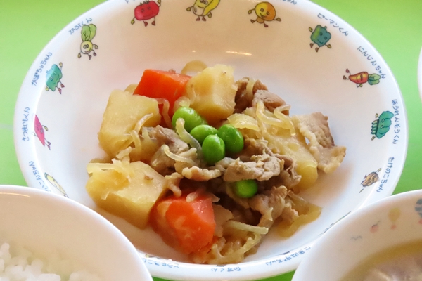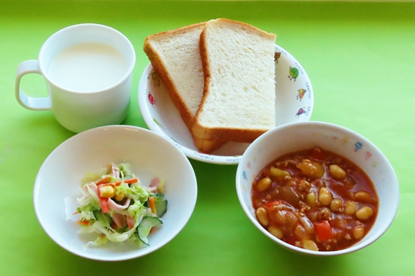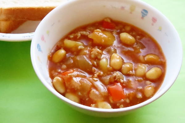 ポークビーンズは大豆の他に、にんじん・たまねぎ・じゃがいもが入っていてとても具沢山です。パンとの相性もよく、みんな良く食べてくれました♪