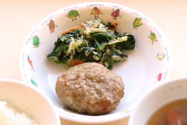レンコンハンバーグは、粗くみじん切りしたレンコンが入っているので食感が楽しいハンバーグです。味はハンバーグのままなのでもちろん子どもたちには大人気でした♪
