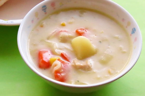 豆乳コーンシチューは、牛乳の代わりに豆乳を使用しているのでさっぱりと食べやすくて人気でした!