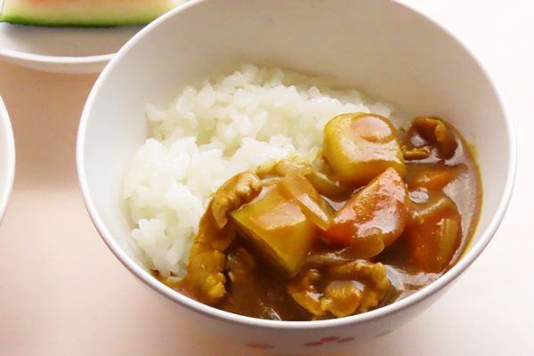 夏休み明け最初の給食はカレーライスでした!みんな大好きなカレーでぺろりと完食してくれました♪みかんが入ったフレンチサラダも大人気でおかわり続出でした^^デザートには保護者の方からいただいたすいかを食べて大満足な子どもたちでした♪