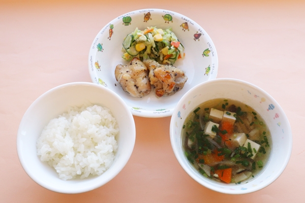 ひじきサラダは、ひじき・ごぼう・にんじんの他に枝豆などが入った具だくさんのサラダです。手づくりの甘めなごまドレッシングが子どもたちに人気な味でした。塩麹焼きも定番ですが大人気なメニューです!